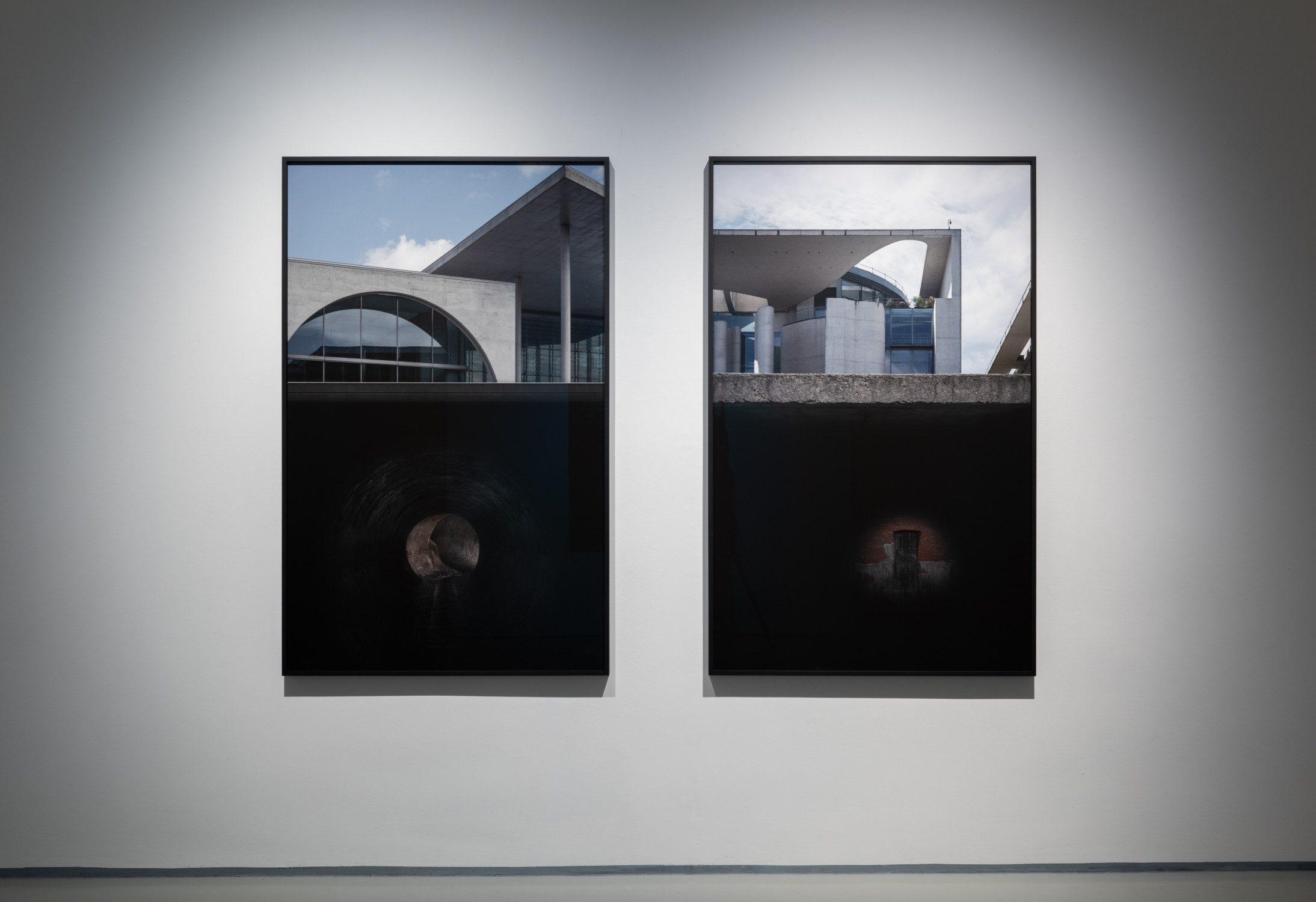 The photo series Parallax underlines this bifurcated understanding of viewing as both truth and deception. Focus on an object and then take turns alternating between closing your right and then left eye. The object appears to move, but that is an illusion. All that has moved is the place from which you are viewing it. Leinkauf stacks images from inside and above the tunnel. Stacking images from above and inside the tunnel, Leinkauf emphasises the collapse of one space into the other. The world outside the cave is folded into the cave. In collage-like montages, architectures of political power encounter places of subjective exclusion, individual re-coding, and symbolic release. Placing them on the same page reveals their common artifice. World and cave are continuous, resembling a cylinder seal, imprinting separate images onto a clay tablet of time, as a single object, turns.