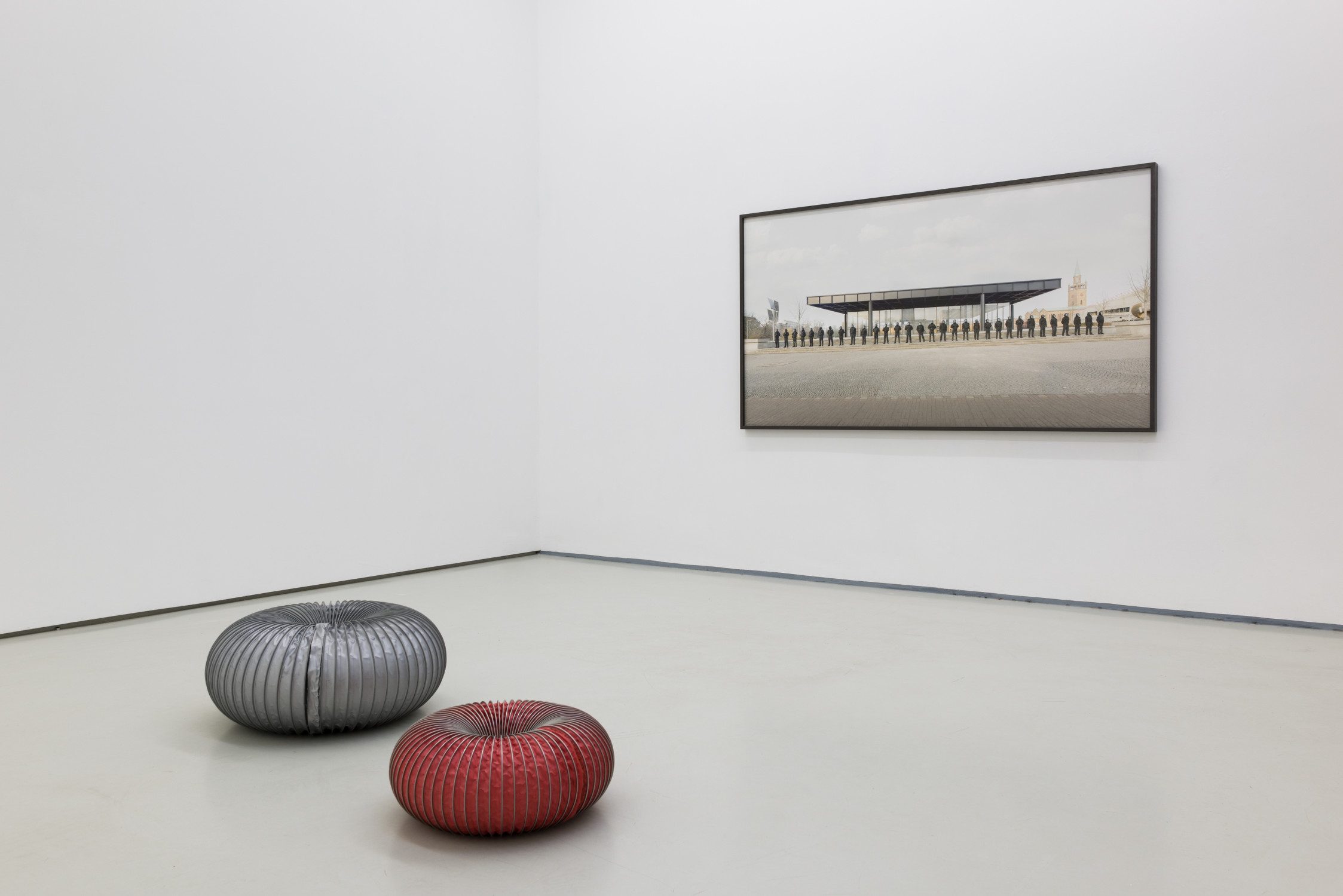In the photograph a long line of uniformed police officers stands on the steps of the Neue Nationalgalerie in Berlin. The location is significant: the museum as a cultural site becomes the stage for a scene of state authority. The presence of the police is frustrating and creates an atmosphere of latent threat. Yet not all the uniformed officers are human; some contain robots, which are indistinguishable to the naked eye. This ambiguity highlights the growing role of technology and artificial intelligence in societal and political structures.