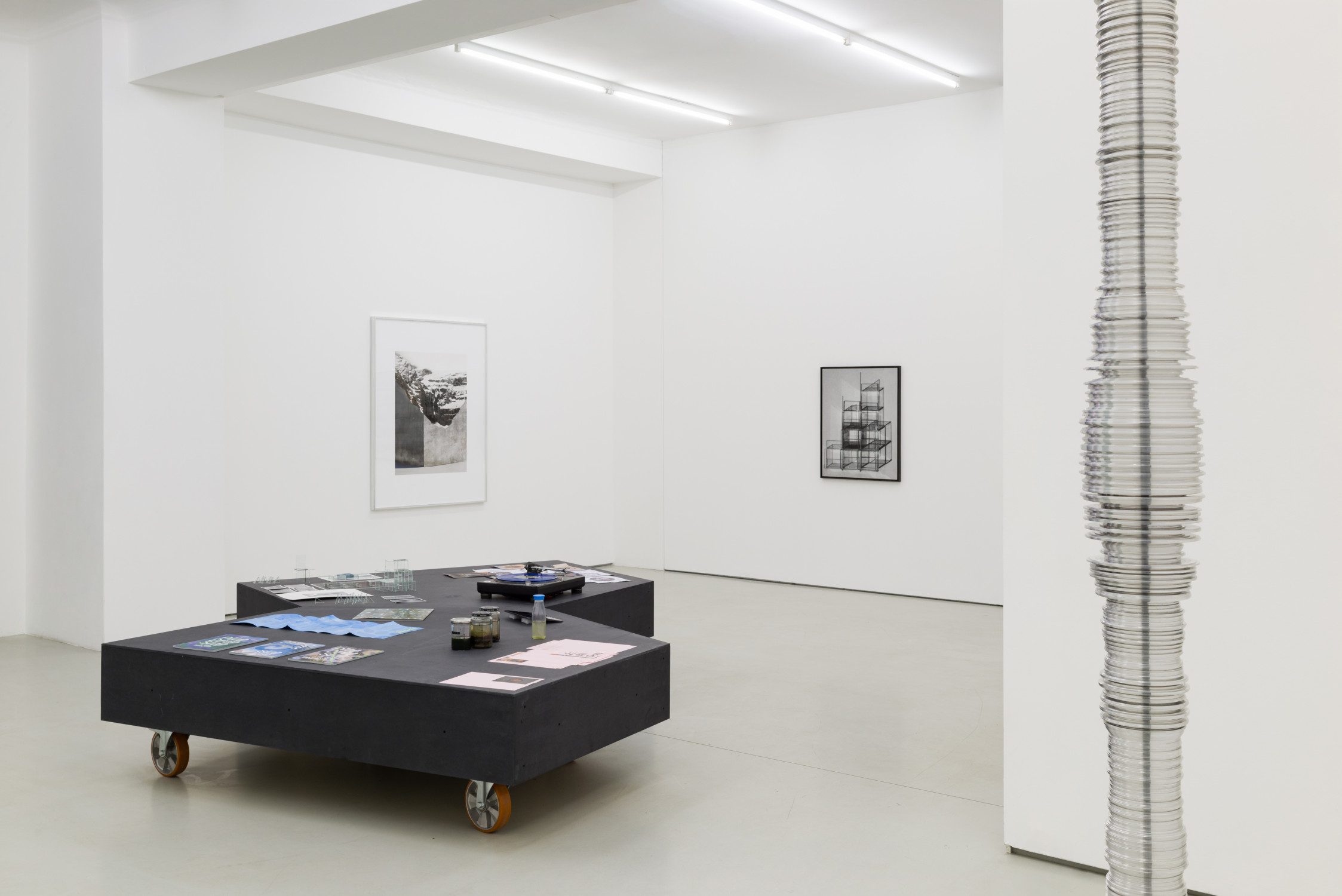 In these works, glass is not only represented and integrated as part of the assemblage, but also serves as the medium through which the shadow drawings are constructed. The layering of object and image produces ambiguous spatial situations: from certain angles, the three-dimensional forms dissolve into lines, while the photographic surface simultaneously suggests depth. Through the assembly of glass panes, the materiality of the glass comes into focus, oscillating between visibility and dissolution due to its transparency.