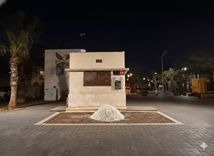 On the historic weighbridge from the British Mandate era, once used to weigh trucks, rests a mound of fish scales. The title, Leviathan, alludes to the formidable creature woven into numerous myths. The whale, a marine mammal, appears in the Book of Job as a monster covered in an impenetrable armor of scales, an undefeatable being that emphasizes the smallness of humankind before it. Hobbes later invoked the image of the Leviathan to describe the state as a powerful, sovereign entity before which nothing can stand. In Littwitz’s work, the scales appear as a protective layer that has been removed, piled up, and revealed as transparent and fragile. Every gust of wind scatters them, lightening their weight and exposing their instability. What first seems like a wall of defense and a symbol of solidity gradually becomes a testament to vulnerability – raising questions about the very nature of protective layers: our own, the body’s, society’s, and the state’s.
